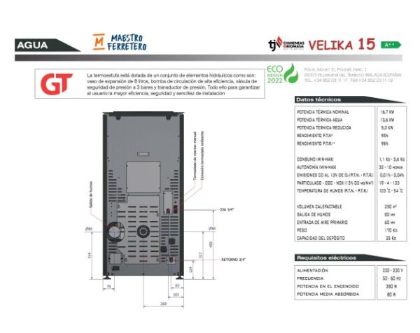Potencia ajustable: Estufa de pellets con potencia térmica regulable de 3,6 a 16,7 kW para calentar espacios de 32 a 250 m³. Eficiencia energética: Calificación energética A++ y diseño Eco 2022 para un funcionamiento eficiente y respetuoso con el medio ambiente. Amplia gama de colores: Disponible en rojo, beige y marrón para adaptarse a la decoración de tu hogar. Fácil de usar: Controles sencillos para ajustar la temperatura y el modo de funcionamiento deseados. Construcción robusta: Estructura de acero resistente con un peso de 170 kg. Sistema conforlux. Incluye sistema anti deflagración y cristal limpio. La termoestufa está dotada de un conjunto de elementos hidráulicos como son: vaso de expansión de 8 litros, bomba de circulación de alta eficiencia, válvula de seguridad de presión a 3 bares, transductor de presión, y purgador automático. Todo ello para garantizar al usuario la mayor eficiencia, seguridad y sencillez de instalación. Innovador diseño para el sistema de anticondensación.